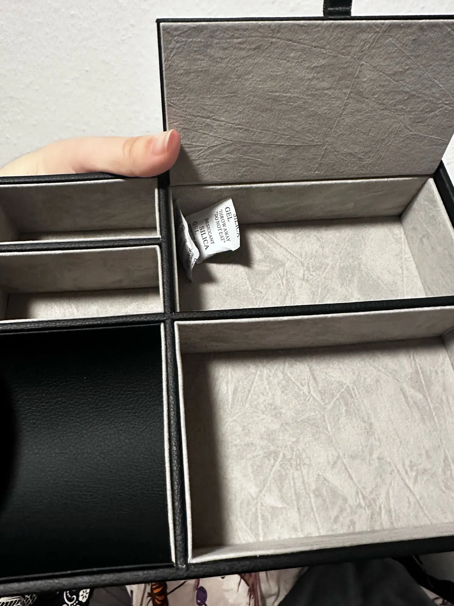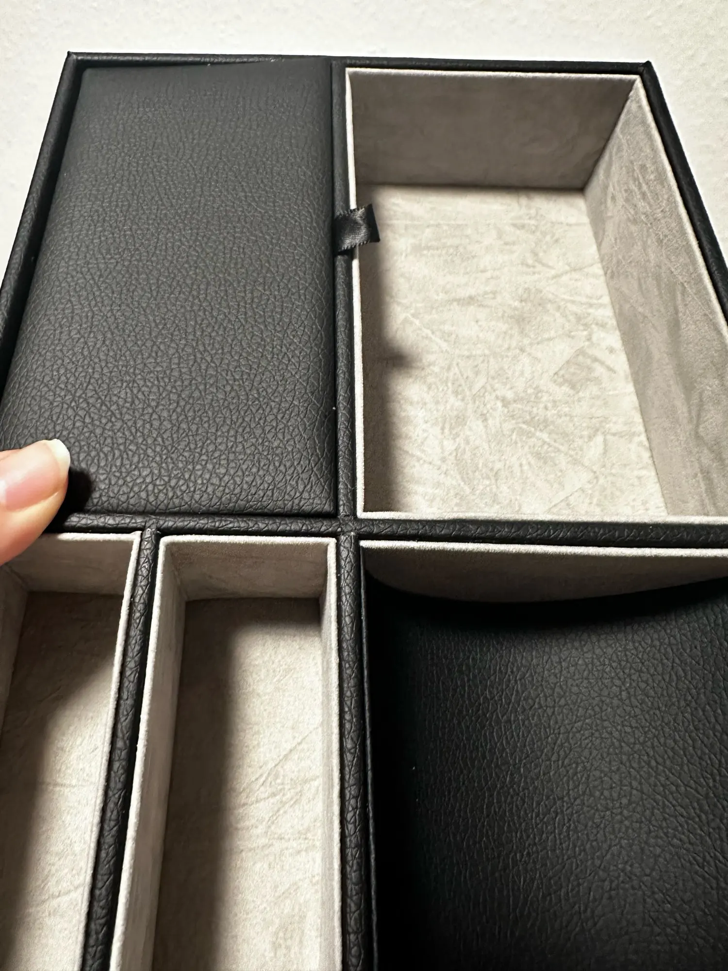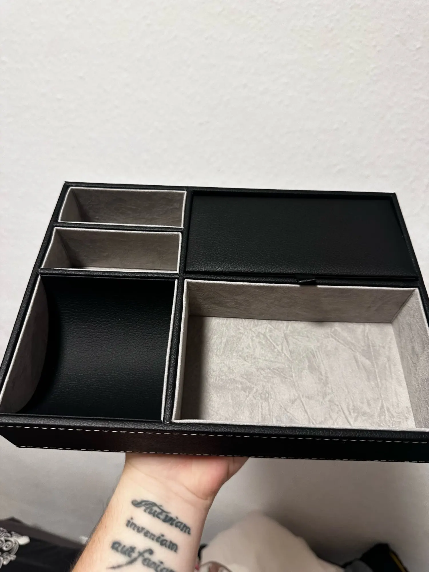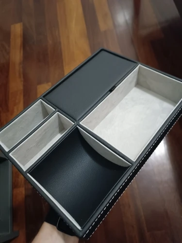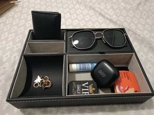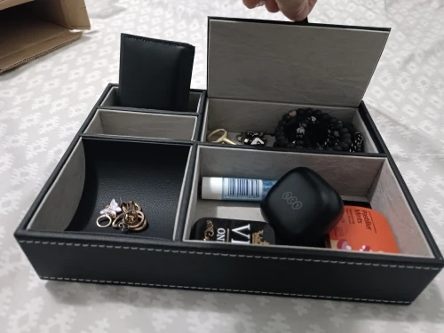 Very nice organizer. Feels like it is of good quality for the price, it has fake leather on its black parts and a velvety texture on the light ones. It also has plenty of separate spaces for small items like glasses, phones, keys, your wallet and other trinkets that would otherwise make a mess. It was delivered very fast